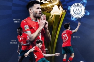 葡萄牙國家隊官方發布海報,祝賀效力巴黎的葡萄牙籍球員若奧·內維斯、維蒂尼亞、努諾·門德斯和貢薩洛·拉莫斯隨隊奪冠,這也是他們隨巴黎和葡萄牙國家隊今年奪得的第7個冠軍,包括:法甲冠軍、法國杯冠軍、法國超級杯冠軍、歐冠冠軍、歐超杯冠軍、洲際杯冠軍以及歐國聯冠軍。