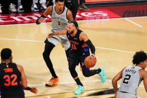 分散的火力其實(shí)適合打尼克斯。之前寫尼克斯的時(shí)候提到過,這個(gè)隊(duì)中路收的還是比較狠的,護(hù)筐也不錯,還有若干素質(zhì)優(yōu)秀的單防人,頭鐵死磕他們并不容易。反倒是馬刺這種東一榔頭西一棒槌的進(jìn)攻好使。季中賽決賽觀感也是如此,馬刺通過漂亮的轉(zhuǎn)移球創(chuàng)造了不少機(jī)會,如果只看前三節(jié),馬刺打得非常好。