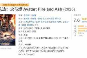 體育資訊12月19日訊?備受影迷期待的卡梅隆新電影《阿凡達:火與燼》(《阿凡達3》)已于今日正式上映!截止至發稿時,本作的豆瓣評分已正式出爐,獲得了7.6分的評價!