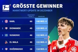 體育資訊12月19日訊 德國轉會市場列出了德甲球員身價上漲排名,卡爾上漲4000萬歐居首。