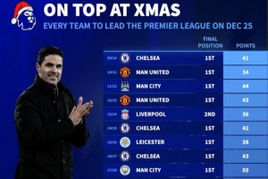 德轉列近年英超聯賽圣誕榜首球隊積分及最終排名: