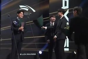 在韓網的一段視頻中,在Gumayusi當選年度最佳AD之前,Keria和Oner就已經在討論要上去送花的事情了,隨后Faker點頭才把身邊的花拿過來準備上去送給Gumayusi。