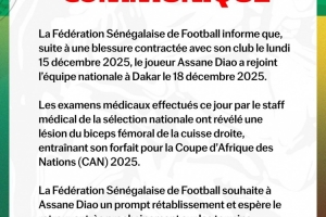 國家隊醫療團隊今日進行的檢查顯示,阿薩尼·迪奧右大腿股二頭肌受傷,無法參加本屆非洲杯。