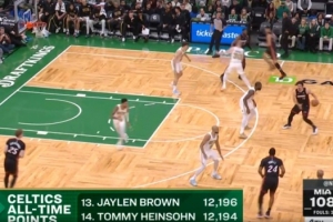 第四節比賽,杰倫·布朗通過上籃得到個人本場第30分,生涯總得分達到12196分,超越湯米·海因索恩,排名凱爾特人隊史第13位。