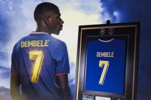 體育資訊12月20日訊 據法國足協官方在線商店顯示,為慶祝登貝萊榮獲2025年金球獎,官方推出了一款極其珍貴的聯名收藏品,帶有獨家金色印字的登貝萊裝裱球衣。