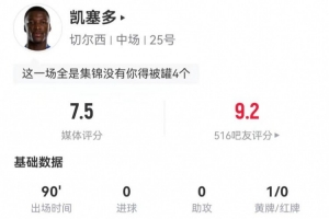 體育資訊12月20日訊 切爾西在本輪英超2-2戰平紐卡,凱塞多本場數據如下: