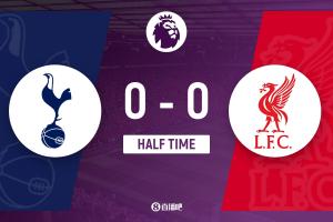 上半場傷停補時3分鐘,半場結束,利物浦暫0-0熱刺。