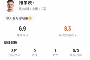 體育資訊12月21日訊 利物浦在本輪英超焦點戰(zhàn)對陣熱刺,維爾茨本場數(shù)據(jù)如下: