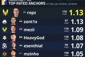 體育資訊12月21日訊 根據由statsmeister1與NER0cs基于HLTV數據聯合發布的“COUNTER-STRIKE 2 - 2025”賽季綜合統計,在嚴格限定為 CT方(防守方)、線下賽事(LAN)、對陣世界排名前20戰隊、且出場地圖數超過50張 的 頂級主防者(TOP RATED ANCHORS) 評分榜單中,選手 ropz 以 1.13 的評分位列榜首;