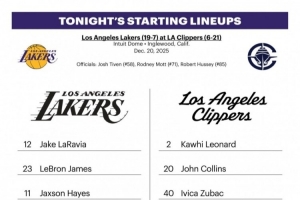 體育資訊12月21日訊 湖人和快船官方公布了今日比賽的首發(fā)陣容。