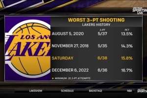 本場比賽湖人三分38中6,命中率15.8%,在隊史超過35次出手的比賽里,命中率排名第三低。