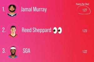 體育資訊12月22日訊 數據專家Kirk Goldsberry曬出了本賽季至今平均每次跳投得分最多的球員榜單,具體如下: