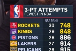 火箭客場挑戰國王,轉播方給出統計,本場比賽之前,火箭本賽季三分出手748次聯盟倒數第一,國王848次倒數第二。