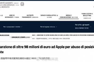 體育資訊12月22日訊 意大利競爭與市場管理局(AGCM)今日宣布,對蘋果公司、Apple Distribution International 和蘋果意大利公司處以 9863.5 萬歐元(現匯率約合 8.14 億元人民幣)罰款,原因是濫用市場支配地位。