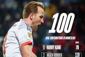 體育資訊12月22日訊 德甲第15輪,拜仁客場4-0大勝海登海姆。本場比賽,凱恩打入一球,這是他在德甲參與的第100個進球,具體數據為81個進球和19個助攻,他只用78場聯賽就達成這一成就。
