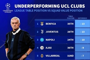 體育資訊11月6日訊 德國轉(zhuǎn)會市場根據(jù)球隊(duì)目前歐冠排名與陣容身價(jià)排名的差距,列出了本賽季歐冠表現(xiàn)不佳球隊(duì)榜,本菲卡、尤文最差。