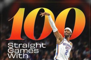這也是亞歷山大連續100場得分上雙,繼續追逐NBA歷史第一的張伯倫(126)。