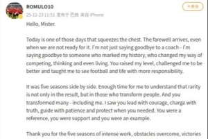 今天真的是讓我感到難過,離別總是來得那么突然,讓人措手不及。我不僅僅是在向一位主教練告別,更是在向一位給我留下深刻印記的人告別,他改變了我的比賽方式、思維模式乃至日常生活。您提升了我的競技水平,激勵我變得更好,并教會我?guī)е嘭?zé)任感看待足球和生活。