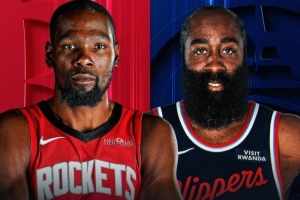 賽前NBA官方曬出海報,寫道:“凱文·杜蘭特(歷史得分榜第8位)將率領火箭隊前往洛杉磯,挑戰詹姆斯·哈登(歷史得分榜第10位)和快船隊。”