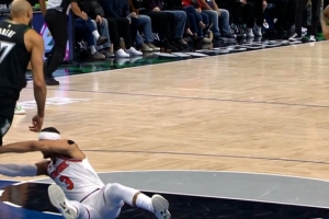 GIF-戈貝爾和哈特搶籃板對抗激烈 哈特倒地后扒拉了一下戈貝爾膝蓋引發沖突