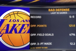 湖人過(guò)去10場(chǎng)5勝5負(fù),場(chǎng)均失分121.6分(聯(lián)盟第六差),對(duì)手投籃命中率47%,對(duì)手場(chǎng)均命中12.2個(gè)三分。