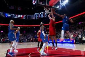 106-107的開拓者落后1分,籃下克林根接球有絕殺機會的扣籃,被身后貝恩按下了!