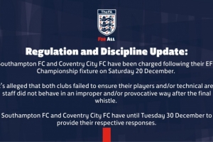 英足總發布公告,確認南安普頓與考文垂因12月20日英冠賽后行為被正式指控。兩家俱樂部均未能確保其球員及/或技術區工作人員在終場哨響后避免不當及/或挑釁性行為。南安普頓與考文垂需在12月30日前各自提交回應。