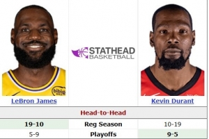 季后賽詹姆斯面對杜蘭特為5勝9負,期間詹姆斯場均轟31.9分10.4籃板9.1助攻;杜蘭特場均攬31.7分8.1籃板4.9助攻。