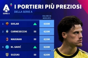 體育資訊12月25日訊 德國轉會市場列出意甲門將身價排名,斯維拉爾3500萬歐居首。
