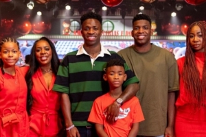 照片中,維尼修斯身穿休閑的綠黑條紋衫,笑容燦爛,被身著紅色節日盛裝的親友環繞。