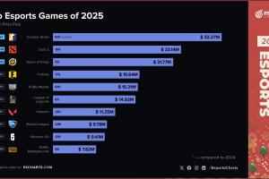 體育資訊12月26日訊?Esports Charts統計2025年總獎金池最多的電競賽事前十名: