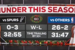 雷霆賽季至今打馬刺:0勝3負 落后兩位數時間32分55秒