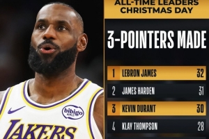 隨著今天比賽中詹姆斯投進一記三分,他生涯圣誕大戰三分命中數達到32記,超越哈登(31記),獨占圣誕大戰歷史三分王。而杜蘭特今天命中4記三分,升到了第三位。賈馬爾·穆雷(今天命中9記)和霍福德的排名也有變化。而前十中,除了雷迪克,其余均為現役球員。