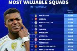 體育資訊12月26日訊 2025年接近尾聲,德轉列出了全球球隊身價排名前二十,皇馬以13.8億歐排名第一,阿森納12.9億歐第二,曼城、巴黎分列第三、第四。