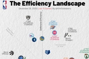 體育資訊12月27日訊 今天,美媒Kirk Goldsberry曬圖統(tǒng)計了NBA過去10場比賽所有球隊的攻防效率,詳情入下: