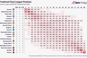 體育資訊12月27日訊 在Opta超算最新的英超奪冠預(yù)測中,阿森納概率下降,目前以68.5%領(lǐng)跑,曼城24.6%第二,維拉5.7%第三,利物浦0.8%第四,切爾西0.4%第五。