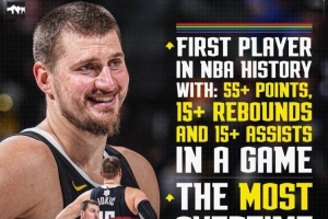 本場,約基奇出戰43分鐘,投籃21中15,三分6中4,罰球23中22,砍下56分16籃板15助攻2蓋帽,正負值+15!