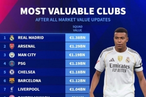體育資訊12月27日訊 德國轉(zhuǎn)會市場更新了各大聯(lián)賽的球員身價,并列出俱樂部身價最新排名,皇馬13.8億歐居首,阿森納、曼城、巴黎前四。