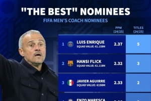 體育資訊11月7日訊 FIFA公布年度最佳男足教練候選名單,德國轉會市場列出了入圍者上賽季的成績。