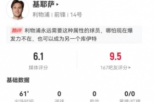 體育資訊12月28日訊 利物浦在本輪英超對陣狼隊,本賽季首次在聯賽首發的小基耶薩本場數據如下: