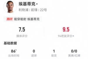 體育資訊12月28日訊 利物浦在本輪英超對陣狼隊,埃基蒂克本場數據如下:
