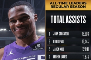 比賽開局3分鐘,威少送出2次助攻,職業生涯助攻次數達到10142次,超越魔術師約翰遜獨占歷史第七!