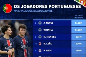 體育資訊12月28日訊 德國轉會市場列出了葡萄牙球員身價排名,若昂·內維斯、維蒂尼亞1.1億歐居首。
