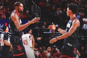 賽后火箭官方曬出本場贏球海報,杜蘭特和阿門擊掌瞬間登上封面。