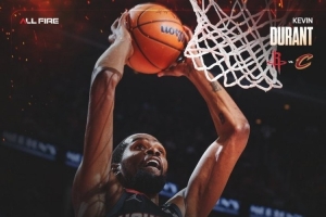 賽后,火箭官方曬圖,發布杜蘭特本場30+4+7的數據海報。