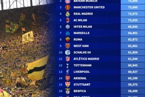 體育資訊12月29日訊 德轉發布2025年歐洲俱樂部場均上座率排行,多特第一、拜仁第二、曼聯第三。
