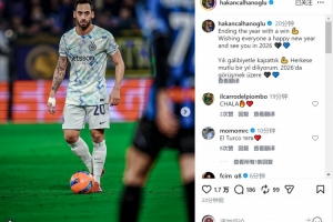 國米中場恰爾汗奧盧社媒曬出比賽照片,并寫道:“以一場勝利結束這一年,祝大家新年快樂,2026年見?!?/p>