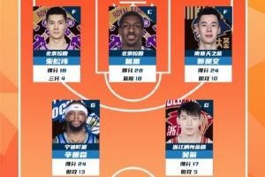 2025-2026賽季CBA聯賽常規賽第7輪結束較量,來自北京控股籃球俱樂部的朱松瑋和佩里,南京同曦籃球俱樂的郭昊文,寧波富邦町渥男籃的辛普森和浙江稠州籃球俱樂部的吳前入選CBA聯賽常規賽第7輪最佳陣容!