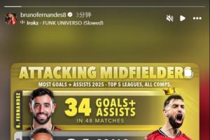 體育資訊12月29日訊 B費更新社媒,曬出自己在2025年五大聯賽進攻型中場進球+助攻數據的排名,他本人以35次進球+助攻位列榜首!