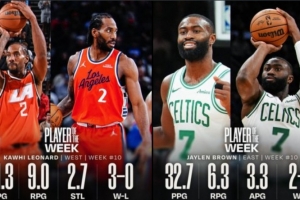 體育資訊12月30日訊 今日NBA官方宣布,杰倫·布朗與小卡分列上周東西部最佳球員。